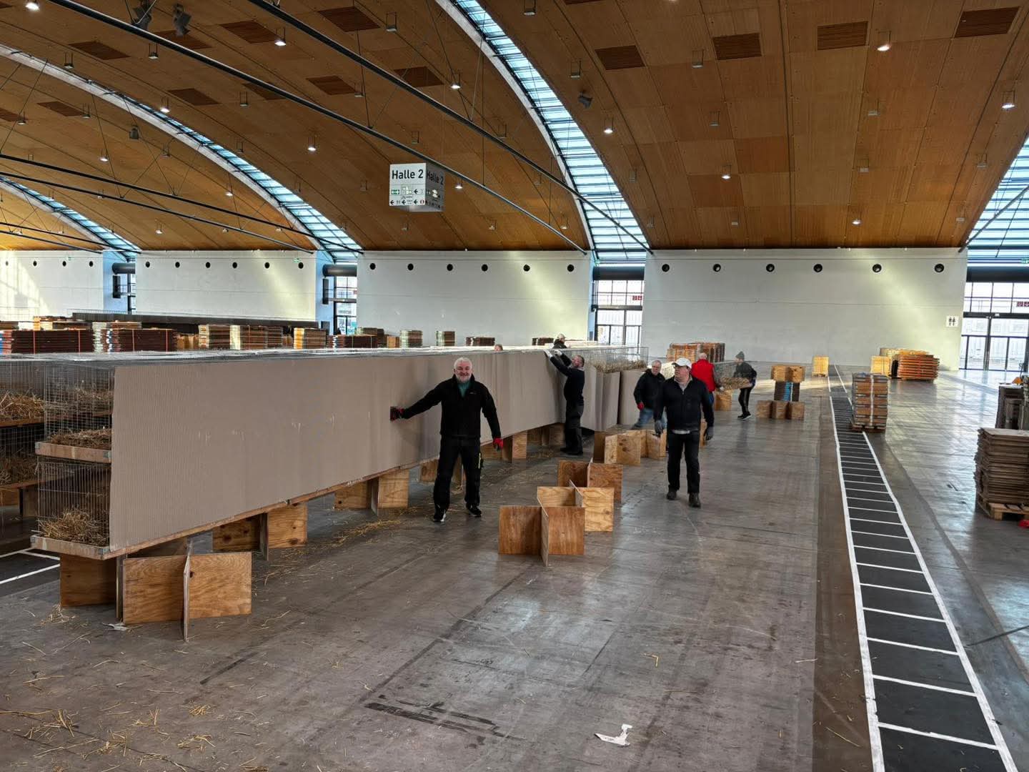 1. Aufbautag am 12.12.2025 heute auf dem Programm: Käfige aufbauen und einstreuen sowie Wellpappe an den Rückwänden anbringen.